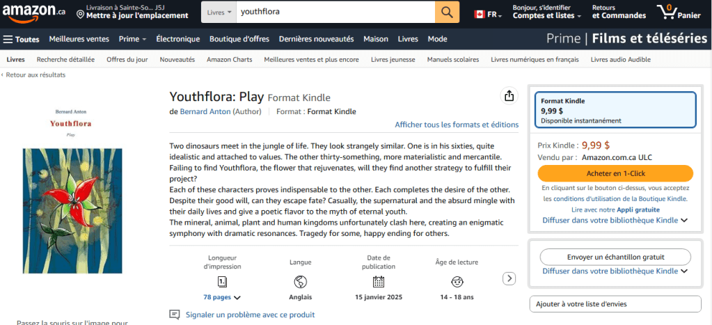 Pièce de théâtre publiée chez Kindle Books Amazon en version numérique, et aux éd. Rouge-gorge d’Amérique en version papier (rougegorgedam.com, rouge-gorgedam@videotron.ca). La traduction en anglais de ce livre est disponible. Voici Jouvenceflore et Youthflora dans le répertoire de Kindle Books Amazon.